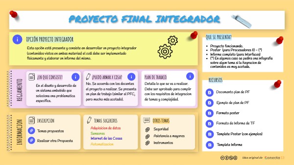Esta opción está presente y consiste en desarrollar un proyecto integrador (contenidos vistos en ambas materias) el cuál debe ser implementado físicamente y elaborar un informe del mismo.