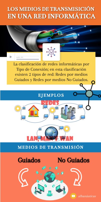 La clasificación de redes informáticas por Tipo de Conexión; en esta clasificación existen 2 tipos de red: Redes por medios Guiados y Redes por medios No Guiados.