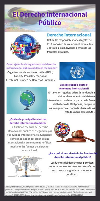 Bibliografia: Estrada, Héctor (28 de enero de 2017). ¿Cuáles son las fuentes del derecho internacional público?. Tareasjuridicas.com, Sarquís, David J. (2012). LAS RELACIONES INTERNACIONALES EN LA HISTORIA: ¿DESDE CUÁNDO EXISTE EL FENÓMENO INTERNACIONAL?. Razón y Palabra, (79), .[fecha de Consulta 4 de Agosto de 2021]. ISSN: . Disponible en: https://www.redalyc.org/articulo.oa?id=199524411046