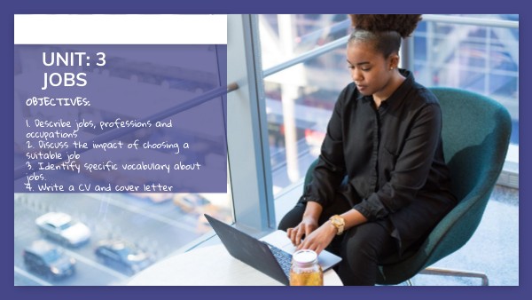 OBJECTIVES:1. Describe jobs, professions and occupations 2. Discuss the impact of choosing a suitable job 3. Identify specific vocabulary about jobs. 4. Write a CV and cover letter