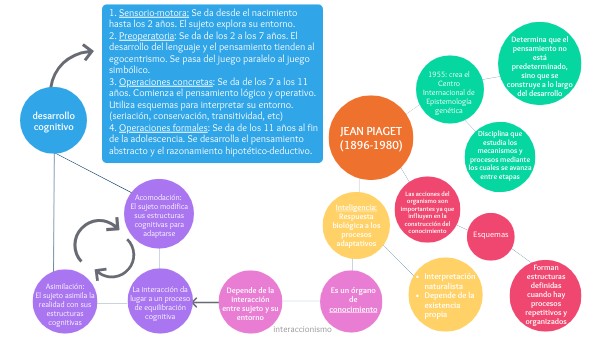 1. Sensorio-motora: Se da desde el nacimiento hasta los 2 años. El sujeto explora su entorno. 2. Preoperatoria: Se da de los 2 a los 7 años. El desarrollo del lenguaje y el pensamiento tienden al egocentrismo. Se pasa del juego paralelo al juego simbólico. 3. Operaciones concretas: Se da de los 7 a los 11 años. Comienza el pensamiento lógico y operativo. Utiliza esquemas para interpretar su entorno. (seriación, conservación, transitividad, etc) 4. Operaciones formales: Se da de los 11 años al fin de la adolescencia. Se desarrolla el pensamiento abstracto y el razonamiento hipotético-deductivo.