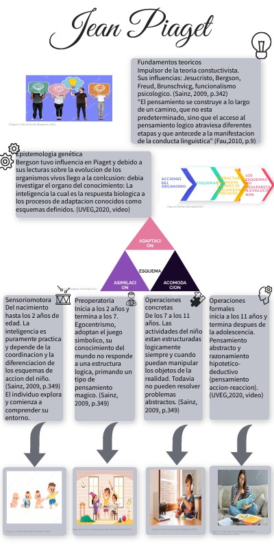 Fundamentos teoricosImpulsor de la teoria constuctivista. Sus influencias: Jesucristo, Bergson, Freud, Brunschvicg, funcionalismo psicologico. (Sainz, 2009, p.342) "El pensamiento se construye a lo largo de un camino, que no esta predeterminado, sino que el acceso al pensamiento logico atraviesa diferentes etapas y que antecede a la manifestacion de la conducta linguistica" (Fau,2010, p.9)