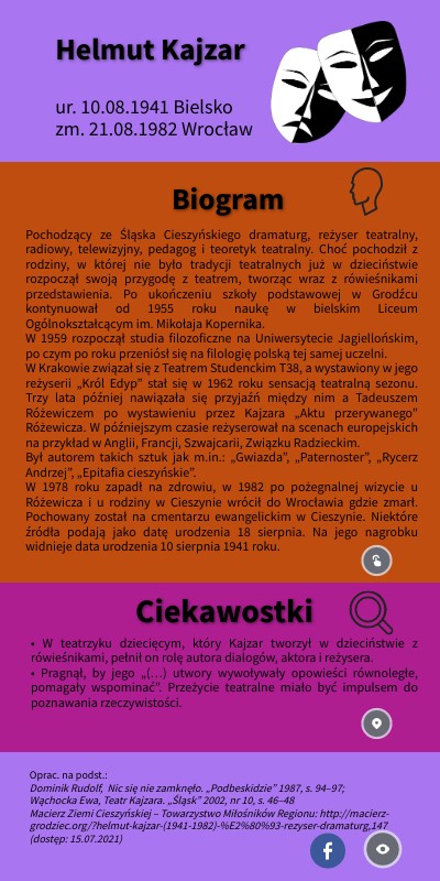 Oprac. na podst.: Dominik Rudolf, Nic się nie zamknęło. „Podbeskidzie” 1987, s. 94–97;Wąchocka Ewa, Teatr Kajzara. „Śląsk” 2002, nr 10, s. 46–48Macierz Ziemi Cieszyńskiej – Towarzystwo Miłośników Regionu: http://macierz-grodziec.org/?helmut-kajzar-(1941-1982)-%E2%80%93-rezyser-dramaturg,147 (dostęp: 15.07.2021)