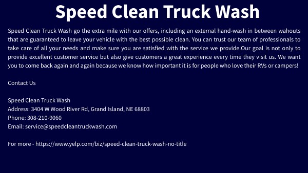 Speed Clean Truck Wash go the extra mile with our offers, including an external hand-wash in between wahouts that are guaranteed to leave your vehicle with the best possible clean. You can trust our team of professionals to take care of all your needs and make sure you are satisfied with the service we provide.Our goal is not only to provide excellent customer service but also give customers a great experience every time they visit us. We want you to come back again and again because we know how important it is for people who love their RVs or campers! Contact Us Speed Clean Truck Wash Address: 3404 W Wood River Rd, Grand Island, NE 68803 Phone: 308-210-9060 Email: service@speedcleantruckwash.com For more - https://www.yelp.com/biz/speed-clean-truck-wash-no-title
