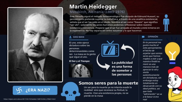 En lo personal me gusta mucho el este pensamiento, el hecho de acpetar que somos seres que fuimos rrojdos a vivir y que nuestra finidd es morir es una manera más de apreciar la vid y vivirla autenticamente sin dictaduras, sin embargo estoy totalmente en desacuerdo con su ideal político, así que toda "admiración" se va a la basur si era nazi