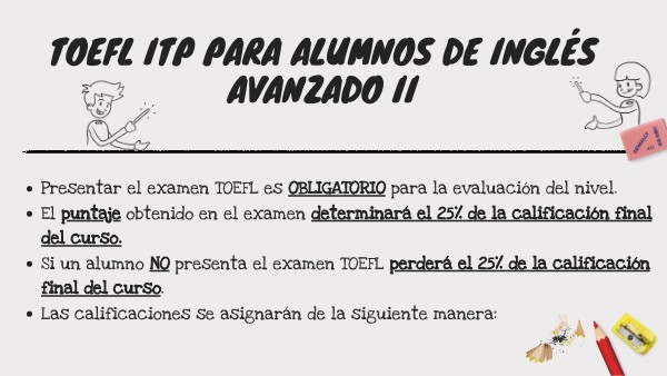 - Si un alumno no se registra o no presenta el examen TOEFL perderá el 25% de la calificación final.