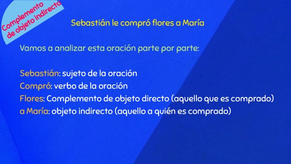 Sebastián le compró flores a María Vamos a analizar esta oración parte por parte: Sebastián: sujeto de la oración Compró: verbo de la oración Flores: Complemento de objeto directo (aquello que es comprado) a María: objeto indirecto (aquello a quién es comprado)