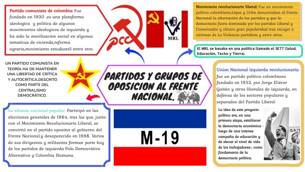 La alianza nacional popular: Participó en las elecciones generales de 1964, tras las que, junto con el Movimiento Revolucionario Liberal, se convirtió en el partido opositor al gobierno del Frente Nacional.y desaparecido en 1998. Varios de sus dirigentes y militantes forman parte hoy de los partidos de izquierda Polo Democrático Alternativo y Colombia Humana.