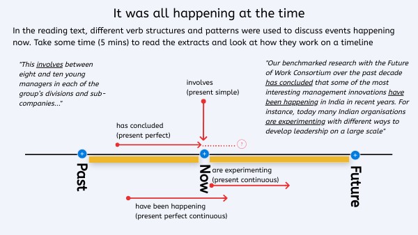 In the reading text, different verb structures and patterns were used to discuss events happening now. Take some time (5 mins) to read the extracts and look at how they work on a timeline