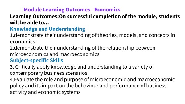 Learning Outcomes:On successful completion of the module, students will be able to... Knowledge and Understanding 1.demonstrate their understanding of theories, models, and concepts in economics 2.demonstrate their understanding of the relationship between microeconomics and macroeconomics Subject-specific Skills 3. Critically apply knowledge and understanding to a variety of contemporary business scenarios 4.Evaluate the role and purpose of microeconomic and macroeconomic policy and its impact on the behaviour and performance of business activity and economic systems