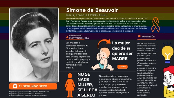 Simone tiene un pensamiento existencialista feminista, en la época su relación liberal con Jean Paul sartre fue causa de muchas polémica llamandolo a él su amor necesario y a los demás como los amores contingentes. Gracias a su concepción del ser humano como libre y dador de sentido, constituye un marco propicio para una teoría de la emancipación de las mujeres, siendo una de las fundadoras del feminismo contemporaneo, se dedicaba a intentar despojar a las mujeres de la opresión que les ejercia la sociedad.