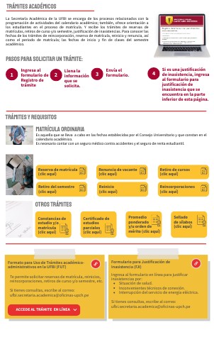 Te permite solicitar reservas de matrícula, reinicios, reincorporaciones, retiros de curso y/o semestre, etc. Si tienes consultas, escribe al correo: ufbi.secretaria.academica@oficinas-upch.pe