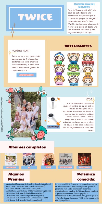 Twice es un grupo músical de surcoreano de 9 integrantes perteneciente a la empresa JYP Entertaiment, el cual crea música tanto en el género k-pop como j-pop.