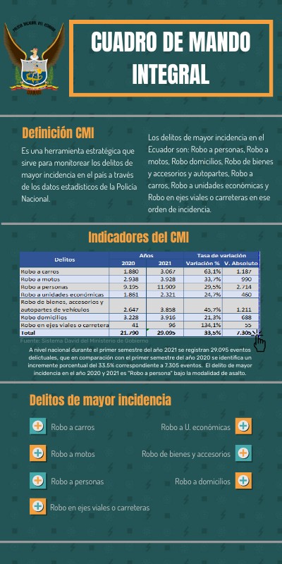 En el Ecuador, a nivel nacional durante el primer semestre del año 2021 se registran 29.095 eventos delictuales, que en comparación con el primer semestre del año 2020 se identifica un incremento porcentual del 33.5% correspondiente a 7.305 eventos. El delito de mayor incidencia en el año 2020 y 2021 es "Robo a persona" bajo la modalidad de asalto.