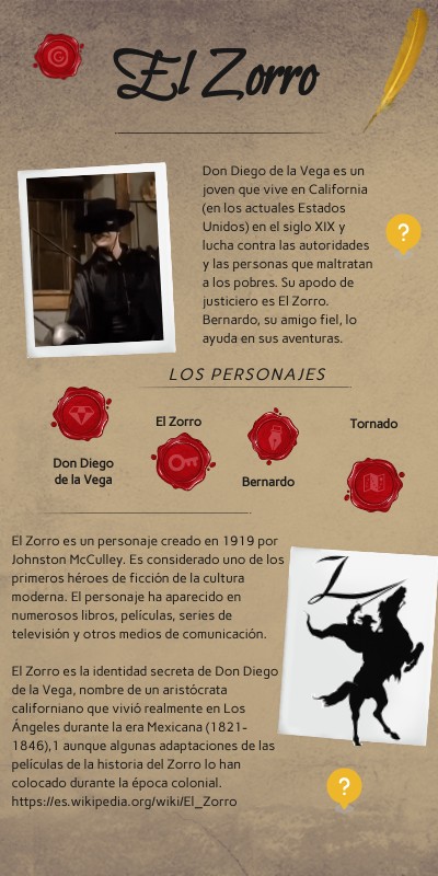 El Zorro es un personaje creado en 1919 por Johnston McCulley. Es considerado uno de los primeros héroes de ficción de la cultura moderna. El personaje ha aparecido en numerosos libros, películas, series de televisión y otros medios de comunicación. El Zorro es la identidad secreta de Don Diego de la Vega, nombre de un aristócrata californiano que vivió realmente en Los Ángeles durante la era Mexicana (1821-1846),1 aunque algunas adaptaciones de las películas de la historia del Zorro lo han colocado durante la época colonial. https://es.wikipedia.org/wiki/El_Zorro