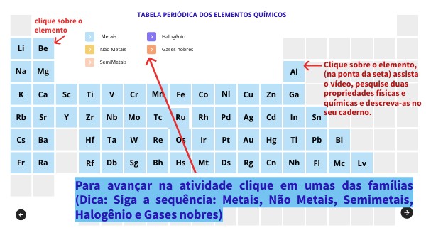 Para avançar na atividade clique em umas das famílias (Dica: Siga a sequência: Metais, Não Metais, Semimetais, Halogênio e Gases nobres)