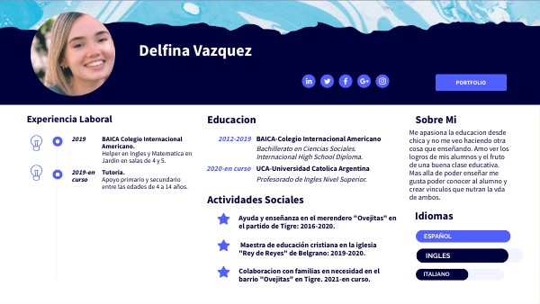 Me apasiona la educacion desde chica y no me veo haciendo otra cosa que enseñando. Amo ver los logros de mis alumnos y el fruto de una buena clase educativa. Mas alla de poder enseñar me gusta poder conocer al alumno y crear vinculos que nutran la vda de ambos.