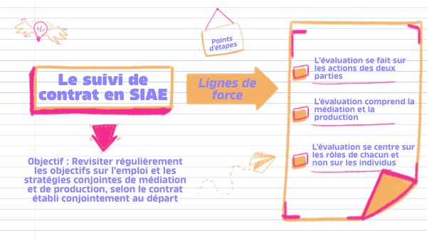 Objectif : Revisiter régulièrement les objectifs sur l’emploi et les stratégies conjointes de médiation et de production, selon le contrat établi conjointement au départ