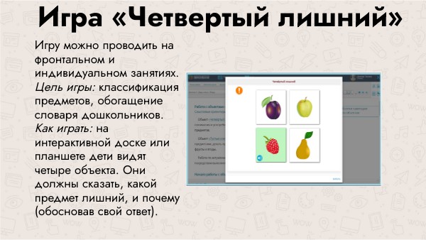Игру можно проводить на фронтальном и индивидуальном занятиях. Цель игры: классификация предметов, обогащение словаря дошкольников. Как играть: на интерактивной доске или планшете дети видят четыре объекта. Они должны сказать, какой предмет лишний, и почему (обосновав свой ответ).