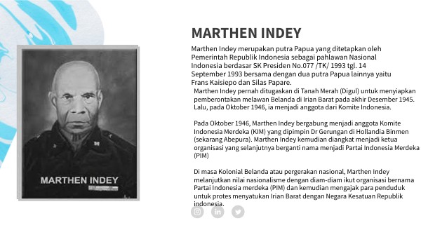 Marthen Indey merupakan putra Papua yang ditetapkan oleh Pemerintah Republik Indonesia sebagai pahlawan Nasional Indonesia berdasar SK Presiden No.077 /TK/ 1993 tgl. 14 September 1993 bersama dengan dua putra Papua lainnya yaitu Frans Kaisiepo dan Silas Papare.