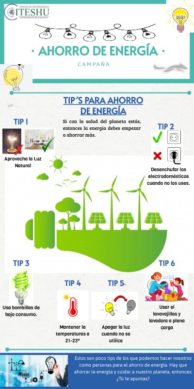 Estos son poco tips de los que podemos hacer nosotros como personas para el ahorro de energía. Hay que ahorrar la energía y cuidar a nuestro planeta, entonces:¿Tú te apuntas?