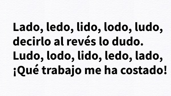 Lado, ledo, lido, lodo, ludo, decirlo al revés lo dudo. Ludo, lodo, lido, ledo, lado, ¡Qué trabajo me ha costado!