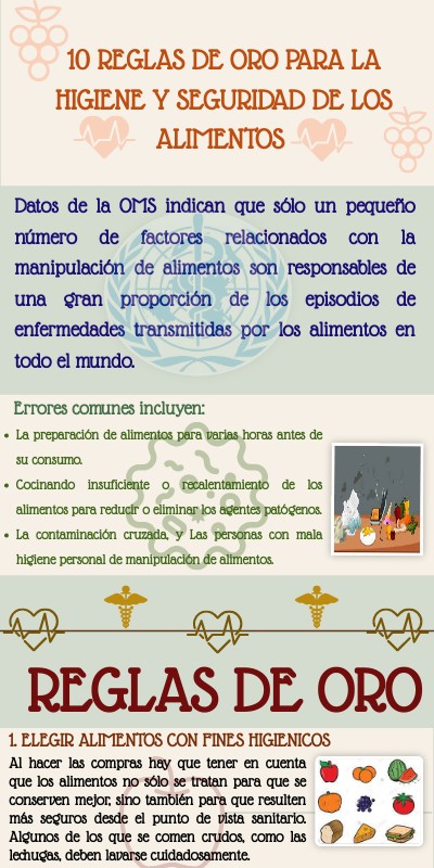 Las Diez Reglas de Oro ayudan a responder a estos errores, ofrece asesoramiento para reducir el riesgo de que los patógenos de los alimentos sean capaces de contaminar, sobrevivir o multiplicarse en las comidas.
