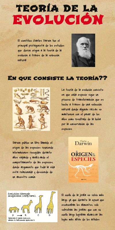 La teoría de la evolución consiste en que cada especie sigue un proceso de transformación que es hecho a traves de una selección natural donde algunas razas se mantienen con el pasar de los años como resultado de la lucha por la conservación de las especies
