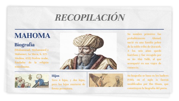 Su biografia se basa en los hadices (VIII), en el siglo ix fueron modificados por Ibn Hisan, que constituyen la biografia del poeta.