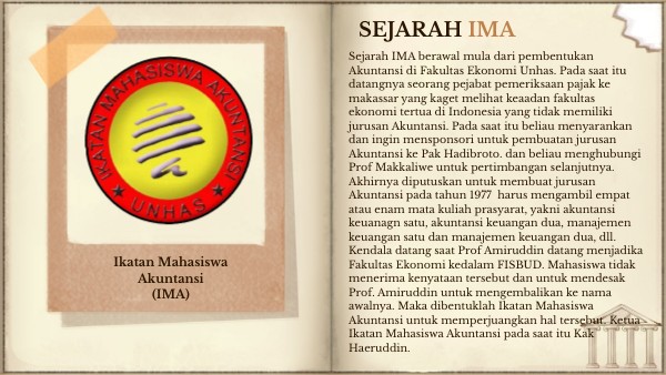 Sejarah IMA berawal mula dari pembentukan Akuntansi di Fakultas Ekonomi Unhas. Pada saat itu datangnya seorang pejabat pemeriksaan pajak ke makassar yang kaget melihat keaadan fakultas ekonomi tertua di Indonesia yang tidak memiliki jurusan Akuntansi. Pada saat itu beliau menyarankan dan ingin mensponsori untuk pembuatan jurusan Akuntansi ke Pak Hadibroto. dan beliau menghubungi Prof Makkaliwe untuk pertimbangan selanjutnya. Akhirnya diputuskan untuk membuat jurusan Akuntansi pada tahun 1977 harus mengambil empat atau enam mata kuliah prasyarat, yakni akuntansi keuanagn satu, akuntansi keuangan dua, manajemen keuangan satu dan manajemen keuangan dua, dll. Kendala datang saat Prof Amiruddin datang menjadika Fakultas Ekonomi kedalam FISBUD. Mahasiswa tidak menerima kenyataan tersebut dan untuk mendesak Prof. Amiruddin untuk mengembalikan ke nama awalnya. Maka dibentuklah Ikatan Mahasiswa Akuntansi untuk memperjuangkan hal tersebut. Ketua Ikatan Mahasiswa Akuntansi pada saat itu Kak Haeruddin.