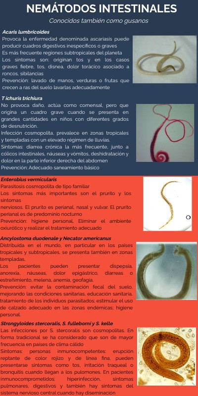 Acaris lumbricoidesProvoca la enfermedad denominada ascariasis puede producir cuadros digestivos inespecíficos o graves Es más frecuente regiones subtropicales del planeta Los síntomas son: originan tos y en los casos graves fiebre, tos, disnea, dolor torácico asociado a roncos, sibilancias Prevención: lavado de manos, verduras o frutas que crecen a ras del suelo lavarlas adecuadamente