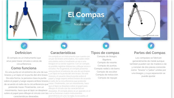 Es una punta en el extremo de uno de sus brazos y un lápiz en la punta del otro brazo. De esta forma, la persona clava la punta sobre el papel y luego separa ambos brazos de acuerdo al radio de la circunferencia que pretende trazar. Finalmente, con un movimiento, hace que el lápiz se desplace sobre el papel para dibujar el círculo con las características deseadas.