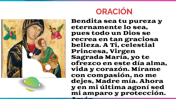 Bendita sea tu pureza y eternamente lo sea, pues todo un Dios se recrea en tan graciosa belleza. A Ti, celestial Princesa, Virgen Sagrada María, yo te ofrezco en este día alma, vida y corazón. Mírame con compasión, no me dejes, Madre mía. Ahora y en mi última agoní sed mi amparo y protección. Amén.