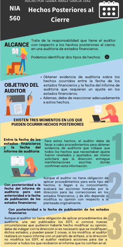 Trata de la responsabilidad que tiene el auditor con respecto a los hechos posteriores al cierre, en una auditoría de estados financieros. Podemos identificar dos tipos de hechos:
