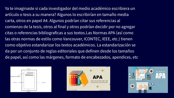 Ya te imaginaste si cada investigador del medio académico escribiera un artículo o tesis a su manera? Algunos lo escribirían en tamaño media carta, otros en papel A4. Algunos podrían citar sus referencias al comienzo de la tesis, otros al final y otros podrían decidir por no agregar citas o referencias bibliograficas a sus textos.Las Normas APA (así como las otras normas de estilo como Vancouver, ICONTEC, IEEE, etc.) tienen como objetivo estandarizar los textos académicos. La estandarización se da por un conjunto de reglas editoriales que definen desde los tamaños de papel, así como las márgenes, formato de encabezados, apendices, etc