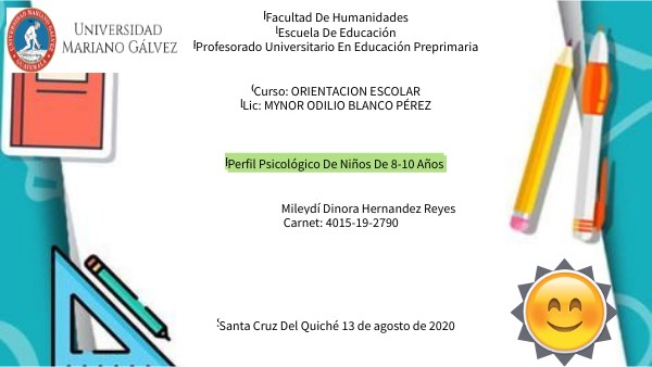 Facultad De Humanidades Escuela De Educación Profesorado Universitario En Educación Preprimaria Curso: ORIENTACION ESCOLAR Lic: MYNOR ODILIO BLANCO PÉREZ Perfil Psicológico De Niños De 8-10 Años Mileydí Dinora Hernandez Reyes Carnet: 4015-19-2790 Santa Cruz Del Quiché 13 de agosto de 2020