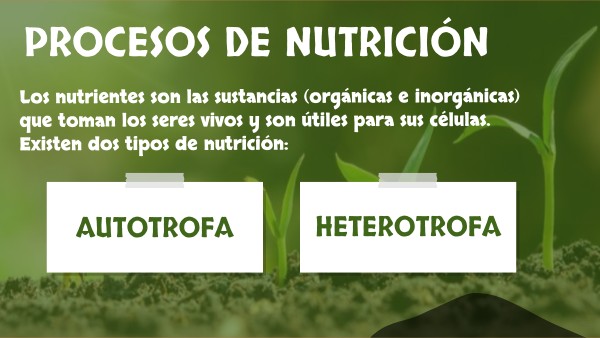 Los nutrientes son las sustancias (orgánicas e inorgánicas) que toman los seres vivos y son útiles para sus células. Existen dos tipos de nutrición: