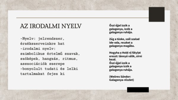 -Nyelv: jelrendszer, érzékszerveinkre hat-irodalmi nyelv: szimbolikus értelmű szavak, szóképek, hangzás, ritmus, asszociációk szerepe -bonyolult tudati és lelki tartalmakat fejez ki