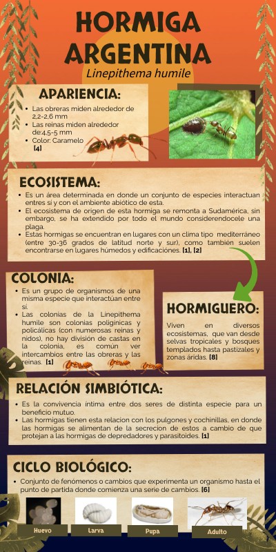 - Las colonias de la Linepithema humile son colonias poligínicas y policálicas (con numerosas reinas y nidos), no hay división de castas en la colonia, es común ver intercambios entre las obreras y las reinas. [1]
