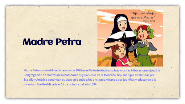 Buenos días. Hoy celebramos la fiesta de Madre Petra, fundadora de nuestra Congregación, una mujer con un corazón de fuego, que supo irradiar el amor de Dios allí donde se encontraba.