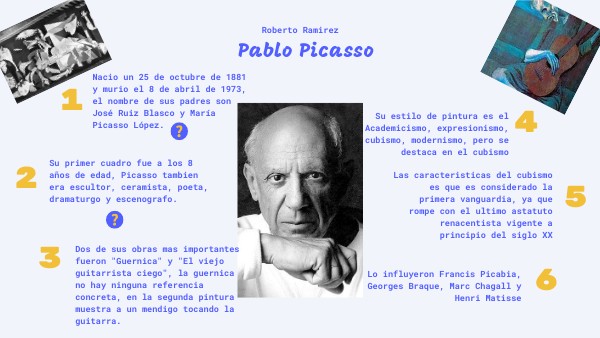 Su primer cuadro fue a los 8 años de edad, Picasso tambien era escultor, ceramista, poeta, dramaturgo y escenografo.