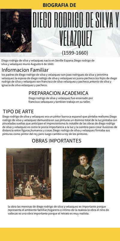 Diego rodrigo de silva y velazquez era un pintor barroca espanol que pintaba realismo.Diego rodrigo de silva y velazquez demuestra en sus pinturas un domino total de la luz,pintaba con pinceladas sueltas que anticipan el impresionismo.lo notable de las obras de diego rodrigo de silva y velazquez es como le ponia importancia a la luz y la sombra para crear ilusiones de distancia entre figuras,humanos y cosas.Diego rodrigo de silva y velazquez firmaba sus pinturas como pintor del rey pero luego cambio a rey de los pintores.