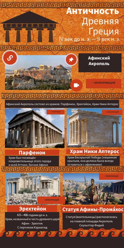 Афинский Акрополь состоял из храмов: Парфенон, Эрехтейон, Храм Ники Аптерос