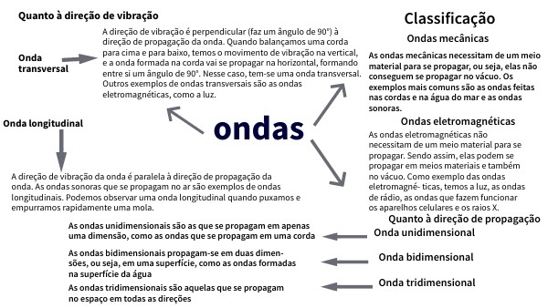 A direção de vibração é perpendicular (faz um ângulo de 90°) à direção de propagação da onda. Quando balançamos uma corda para cima e para baixo, temos o movimento de vibração na vertical, e a onda formada na corda vai se propagar na horizontal, formando entre si um ângulo de 90°. Nesse caso, tem-se uma onda transversal. Outros exemplos de ondas transversais são as ondas eletromagnéticas, como a luz.