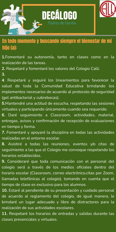 1.Fomentaré su autonomía, tanto en clases como en la realización de las tareas.2. Respetaré y fomentaré los valores del Colegio Calli. 3. 4. Respetaré y seguiré los lineamientos para favorecer la salud de toda la Comunidad Educativa brindando los implementos necesarios de acuerdo al protocolo de seguridad (gel antibacterial y cubrebocas). 5.Mantendré una actitud de escucha, respetando las sesiones virtuales y participando únicamente cuando sea requerido. 6. Daré seguimiento a Classroom, actividades, material, entregas, avisos y confirmación de recepción de evaluaciones en tiempo y forma. 7. Fomentaré y apoyaré la disciplina en todas las actividades realizadas en el entorno escolar. 8. Asistiré a todas las reuniones, eventos y/o citas de seguimiento a las que el Colegio me convoque respetando los horarios establecidos. 9. Consideraré que toda comunicación con el personal del colegio será a través de los medios oficiales dentro del horario escolar (Classroom, correo electrónico,citas por Zoom, llamadas telefónicas al colegio), tomando en cuenta que el tiempo de clase es exclusivo para los alumnos. 10. Estaré al pendiente de su presentación y cuidado personal de acuerdo al reglamento del colegio, de igual manera, le brindaré un lugar adecuado y libre de distractores para la realización de sus actividades escolares. 11. Respetaré los horarios de entradas y salidas durante las clases presenciales y virtuales.