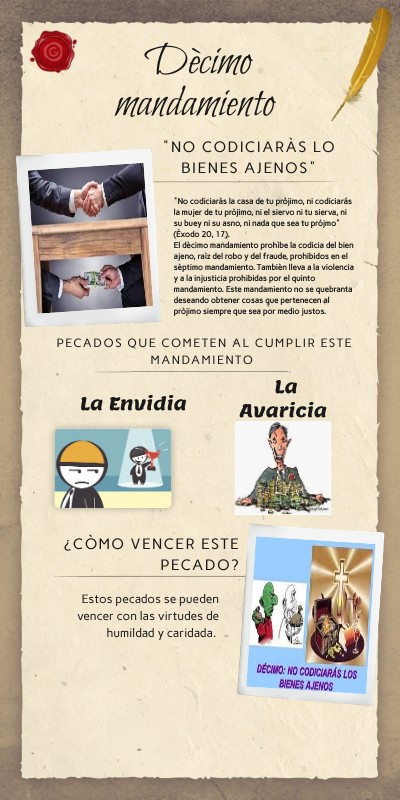 "No codiciaràs la casa de tu pròjimo, ni codiciarás la mujer de tu pròjimo, ni el siervo ni tu sierva, ni su buey ni su asno, ni nada que sea tu prójmo" (Éxodo 20, 17). El dècimo mandamiento prohìbe la codicia del bien ajeno, raìz del robo y del fraude, prohibidos en el sèptimo mandamiento. Tambièn lleva a la violencia y a la injusticia prohibidas por el quinto mandamiento. Este mandamiento no se quebranta deseando obtener cosas que pertenecen al pròjimo siempre que sea por medio justos.