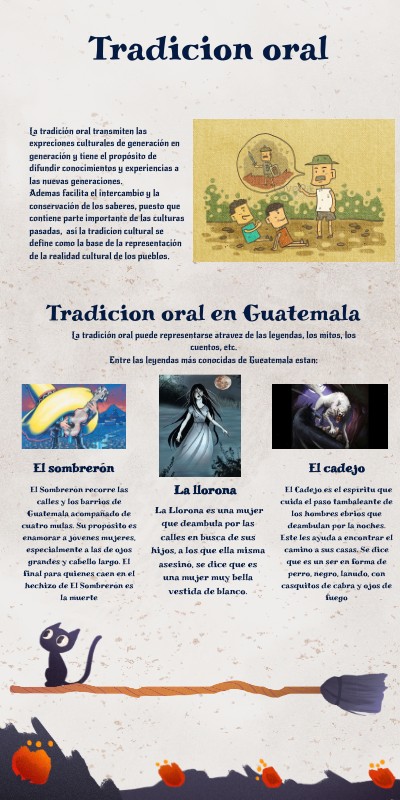 La tradición oral puede representarse atravez de las leyendas, los mitos, los cuentos, etc.Entre las leyendas más conocidas de Gueatemala estan:
