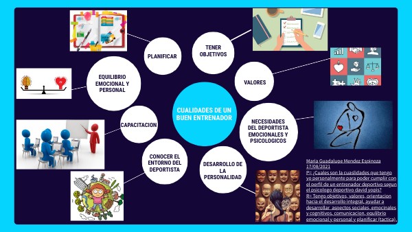 Maria Guadalupe Mendez Espinoza 17/08/2021 P= ¿Cuales son la cuaslidades que tengo yo personalmente para poder cumplir con el perfil de un entrenador deportivo segun el psicologo deportivo david yopis? R= Tengo objetivos, valores, orientacion hacia el desarrollo integral, ayudar a desarrollar aspectos sociales, emocinales y cognitivos, comunicacion, equlibrio emocional y personal y planificar (tactica).