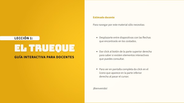 A continuación presentamos la guía que te permitirá conducir paso a paso a tus estudiantes en el desarrollo de la Lección 1 “El Trueque” del Programa El dinero en México. La lección tiene como objetivo desarrollar un aprendizaje profundo, significativo y eficaz, a través de la aplicación de las herramientas cognitivas de la imaginación, cuyo sustento pedagógico lo encontrarás en el anexo: Educación imaginativa.