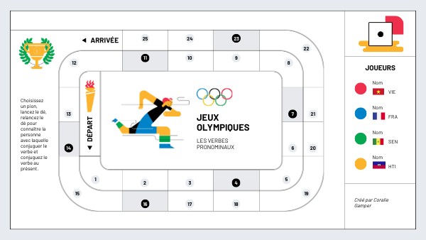 Choisissez un pion, lancez le dé, relancez le dé pour connaître la personne avec laquelle conjuguer le verbe et conjuguez le verbe au présent.